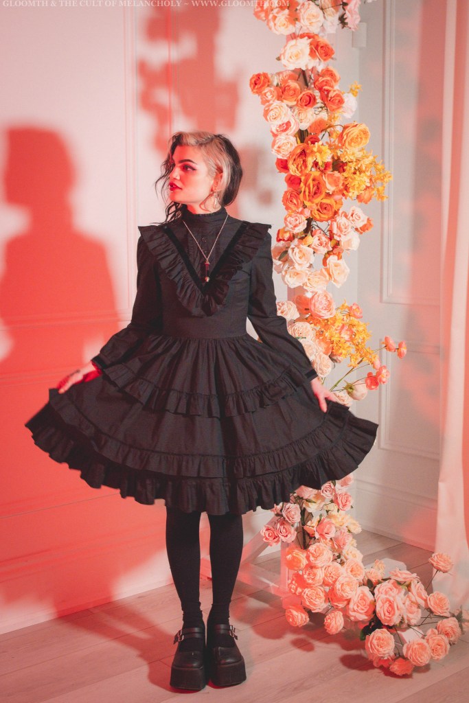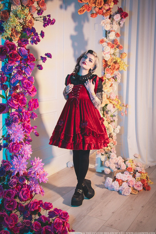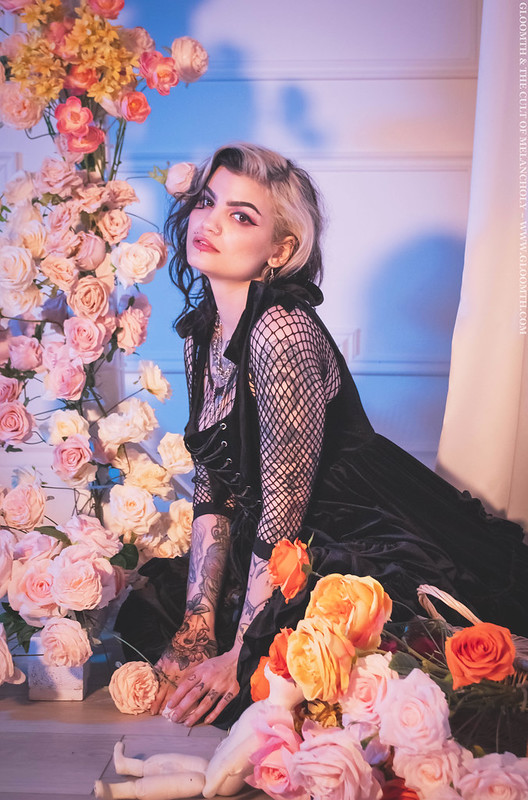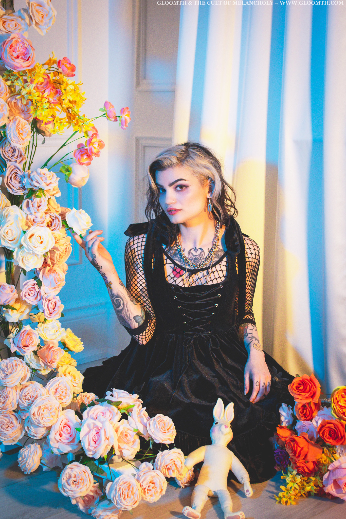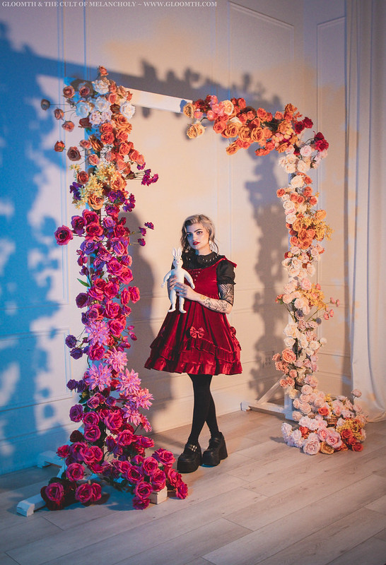 Jessica wore a variety of Gloomth designs in this simple studio space with a floral arch. I think the environment really showcases the outfits and her modeling.