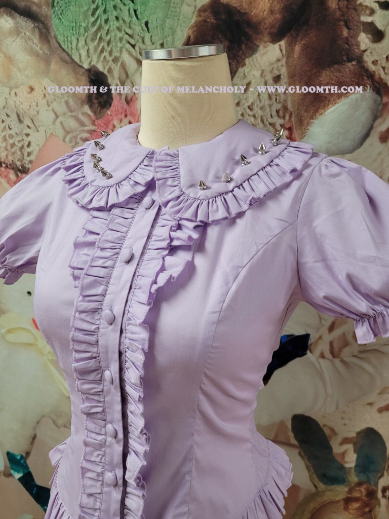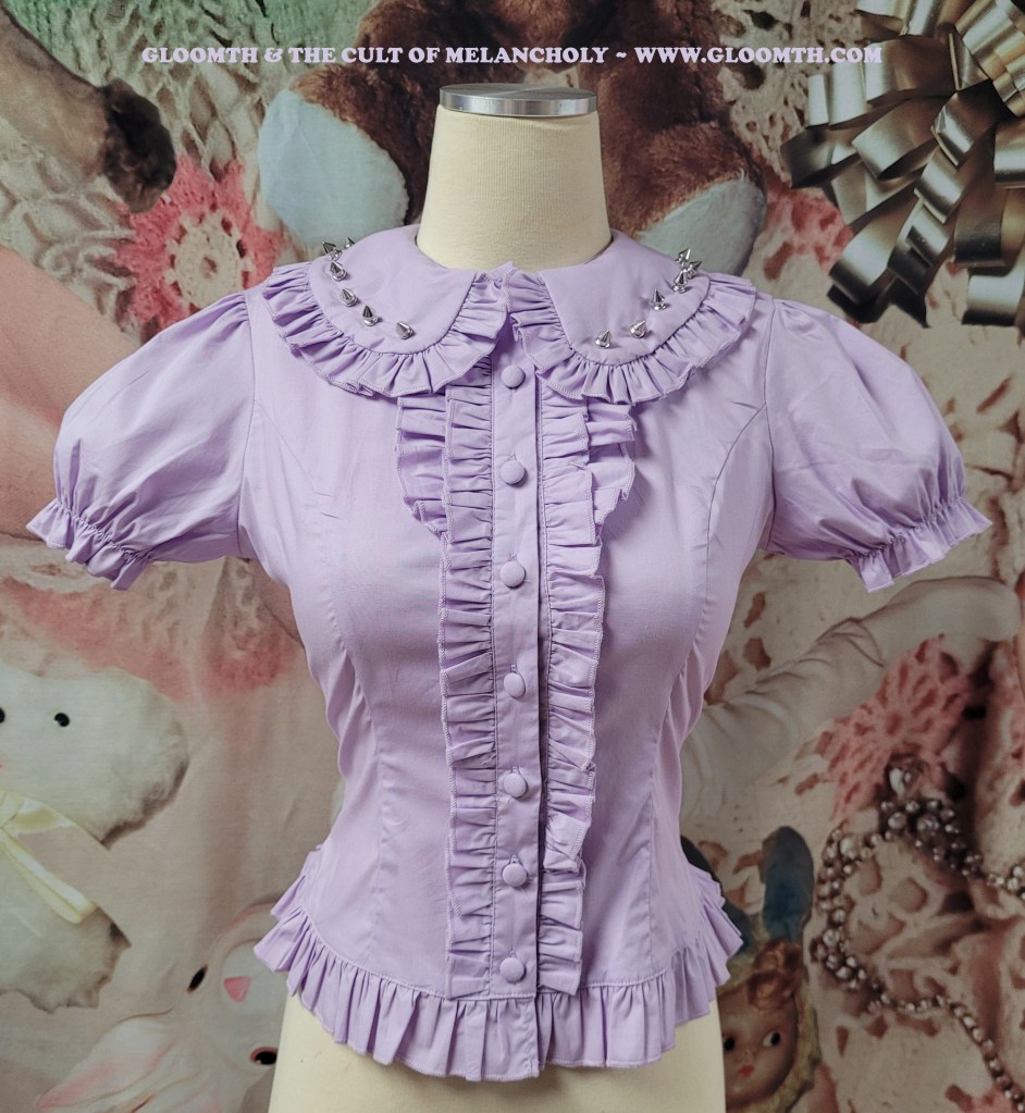 The last of our new spiked blouses is here! Our lavender “Halberd” blouse is the perfect blend of saccharine sweet and deadly. A soft cotton poplin blouse with loads of ruffles and lacing, finished with spikes!