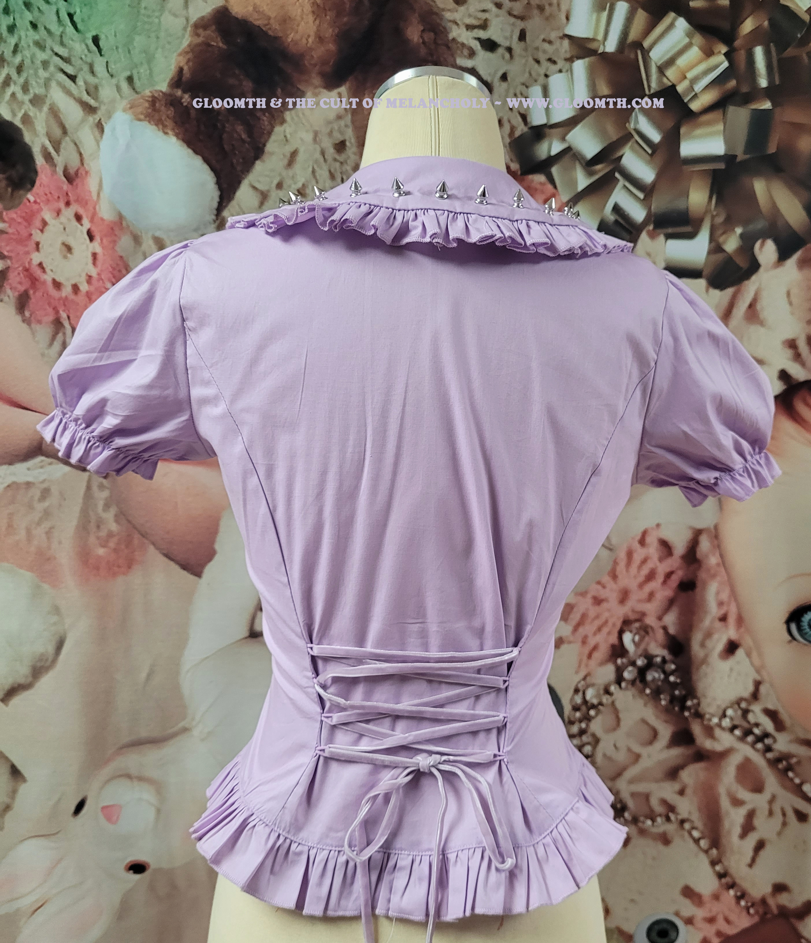 The last of our new spiked blouses is here! Our lavender “Halberd” blouse is the perfect blend of saccharine sweet and deadly. A soft cotton poplin blouse with loads of ruffles and lacing, finished with spikes!