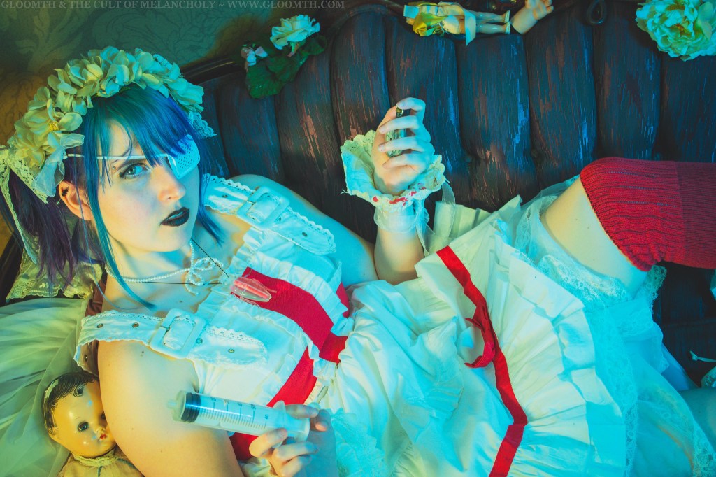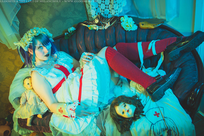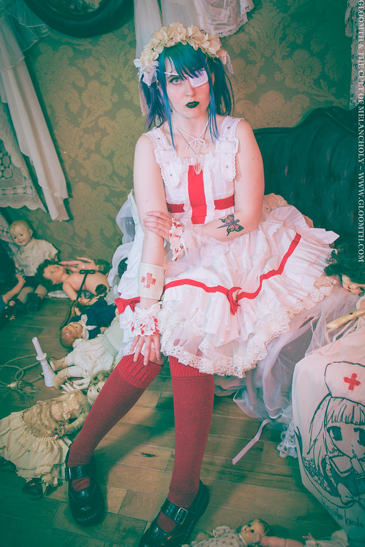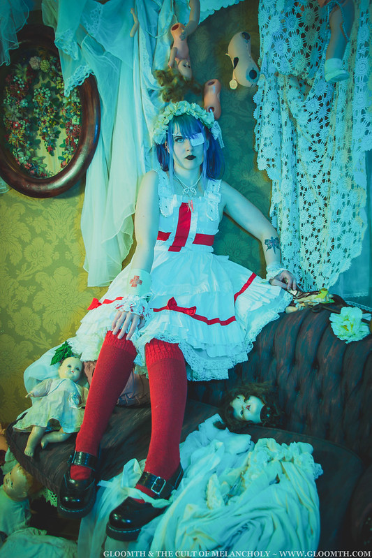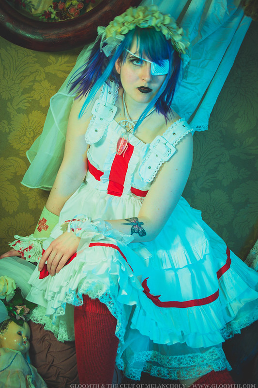 Pixie modeled our “Cure” dress in this antique or vintage take on a gurololita coord. Paired with red over the knee socks, a lace trimmed petticoat, and a plastic eyepatch.