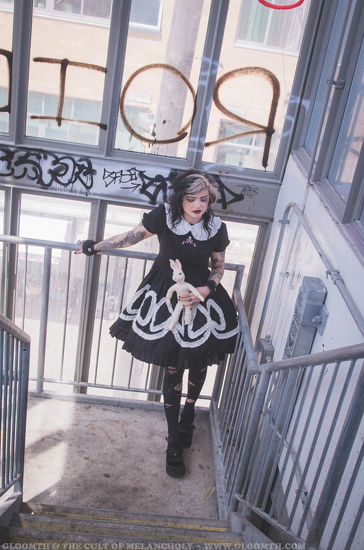 Model Jessica Rose wore our “Fondant” dress here with layered ripped tights, platforms, and wrist cuffs (also available on our site), as a casual easy to wear look. A little less over the top than many of the outfits we feature in our shoots.