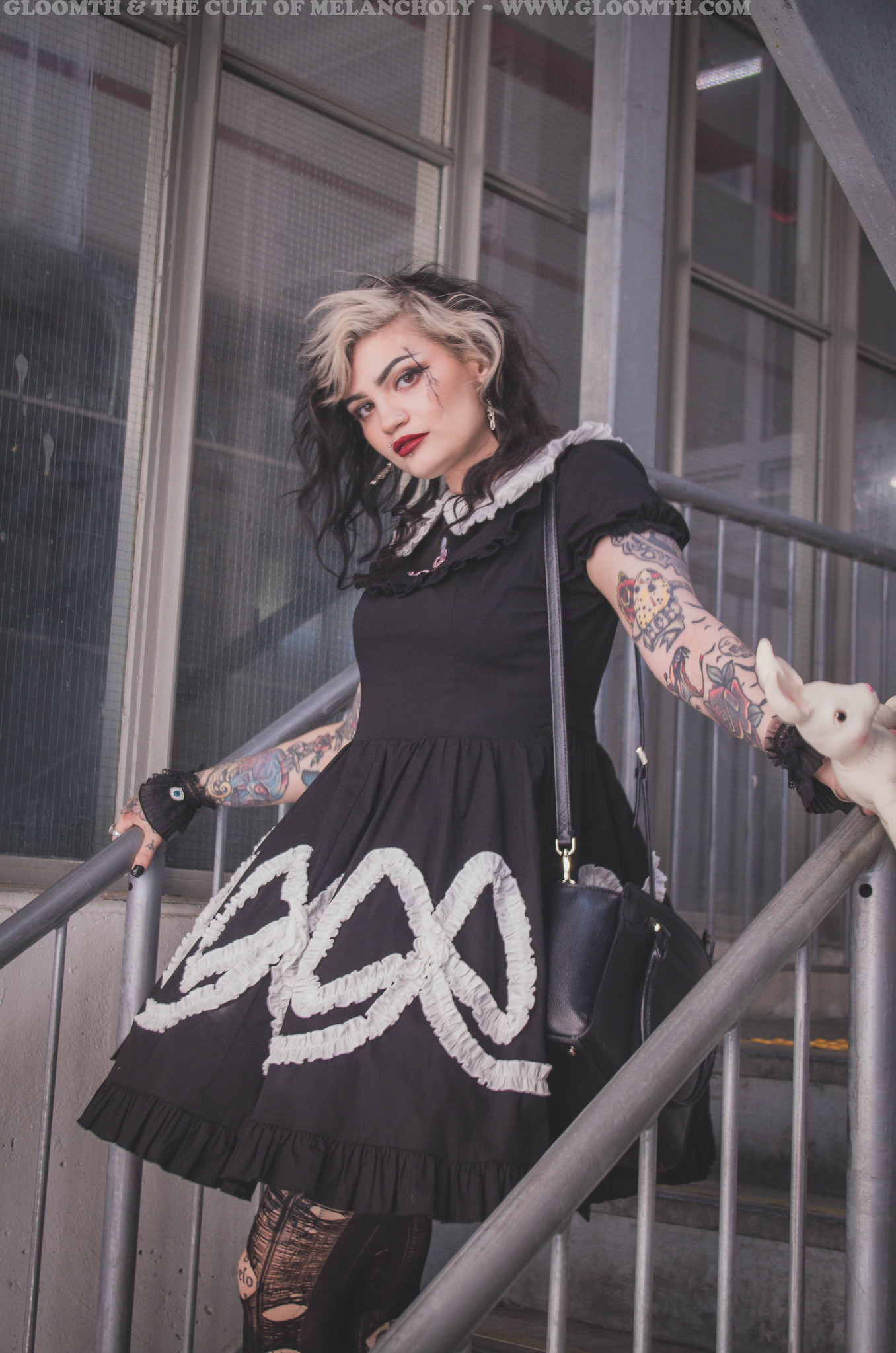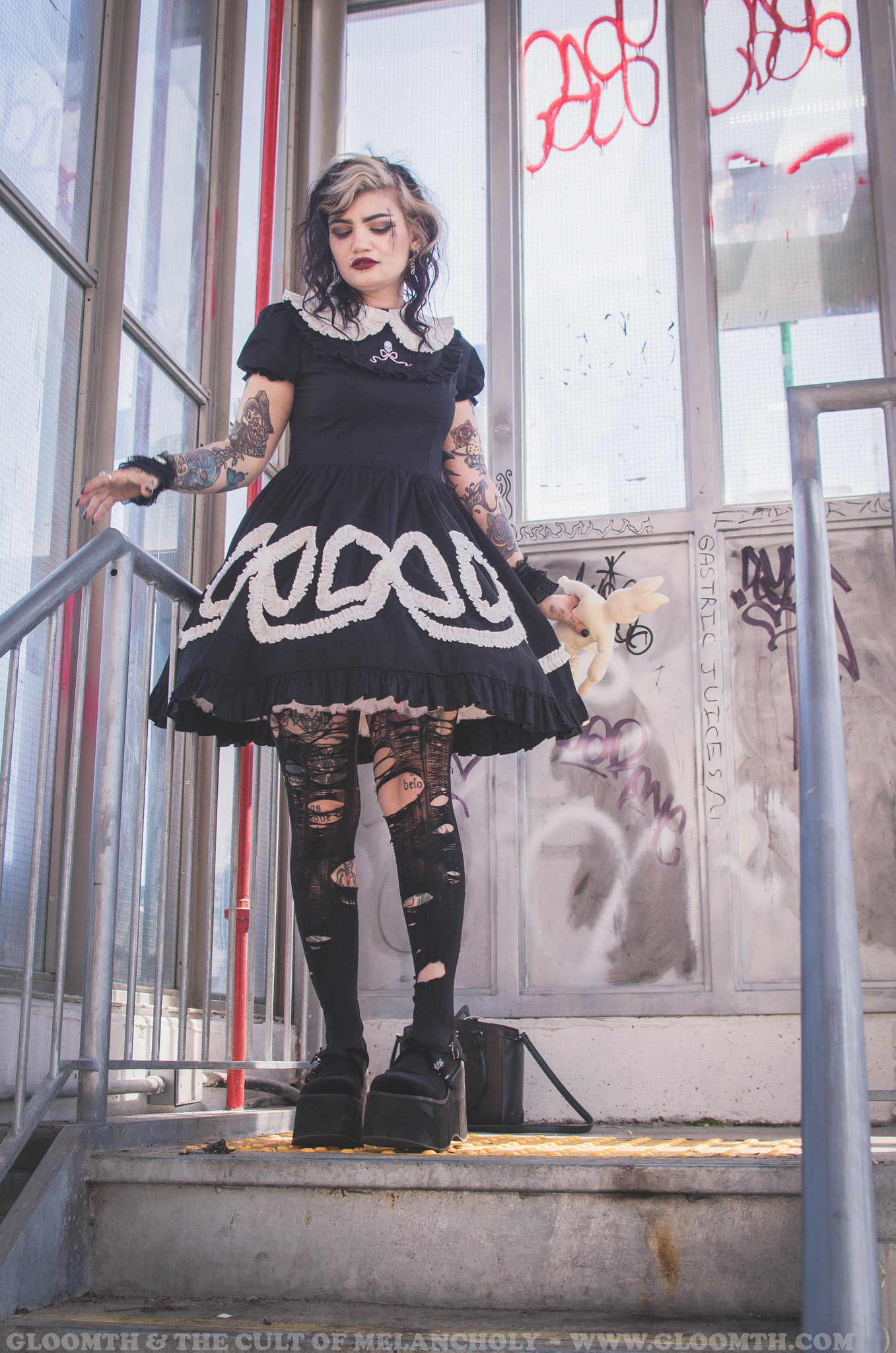 Model Jessica Rose wore our “Fondant” dress here with layered ripped tights, platforms, and wrist cuffs (also available on our site), as a casual easy to wear look. A little less over the top than many of the outfits we feature in our shoots.