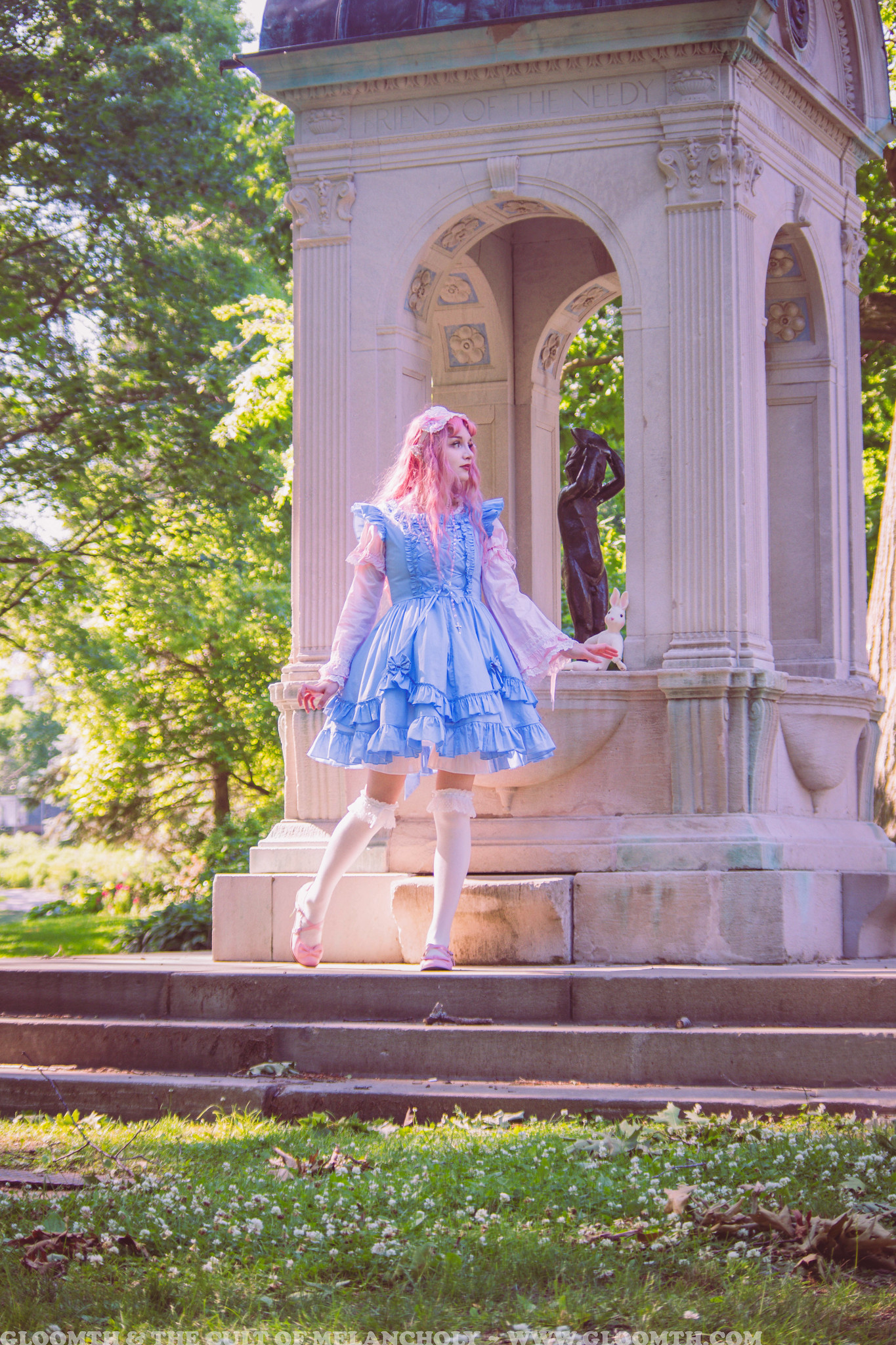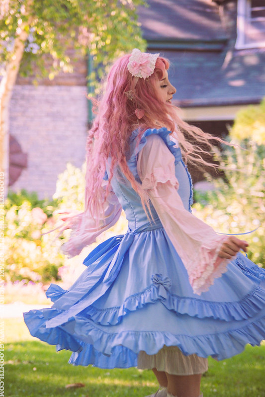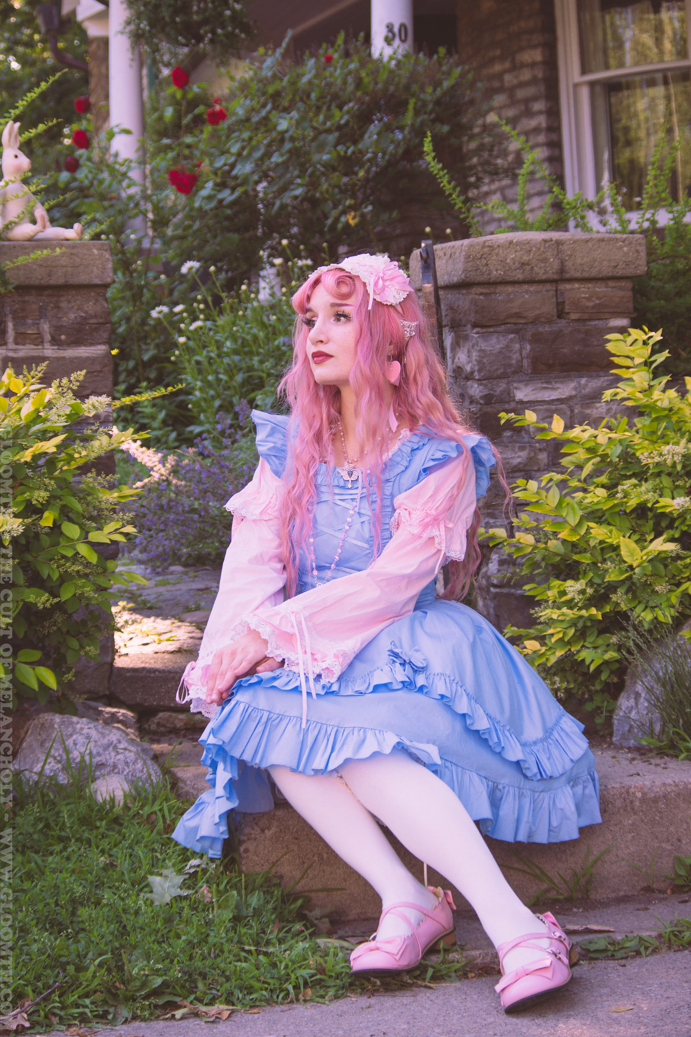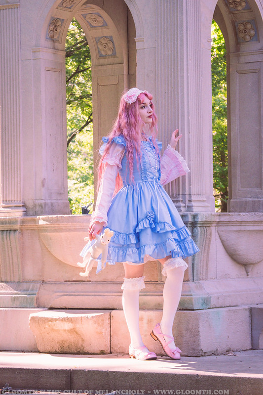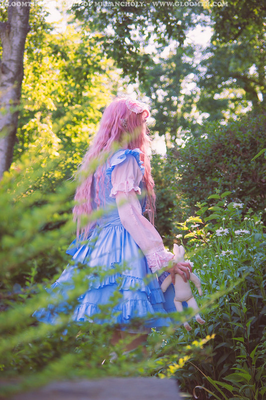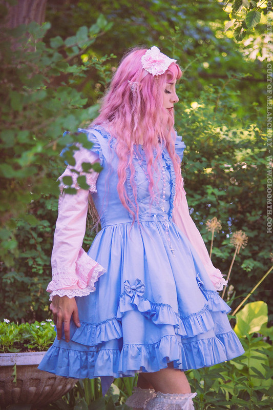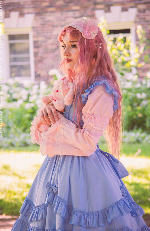Luna wore our “Alice’s Pool of Tears” jsk with a pale pink lolita blouse and headdress. It’s such an old school lolita vibe and I just love how it looks with her long lavender hair.
