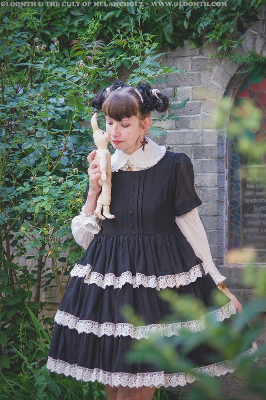 Karen is wearing our “Laudanum” dress, we have a handful of these left and they won’t be restocked. It’s a beautiful style with tiers of soft chiffon and lace, and it’s fully lined in cotton so it’s breathable on warm days.