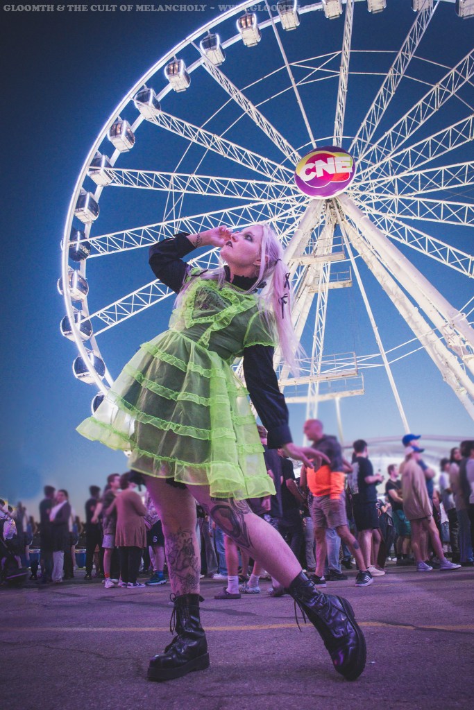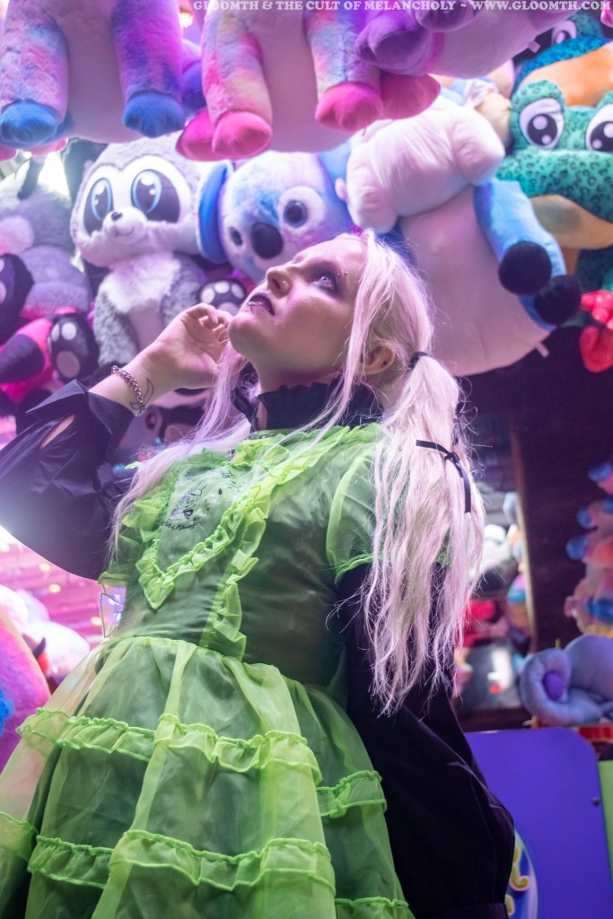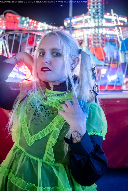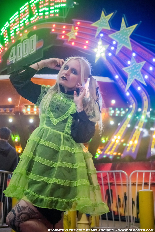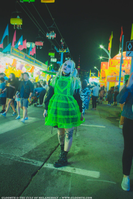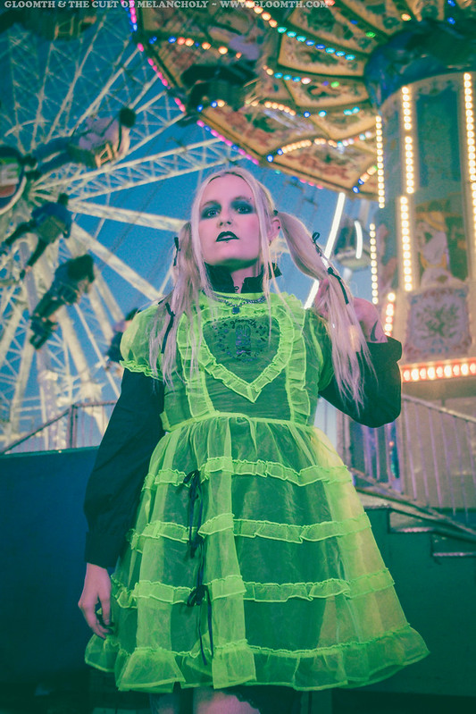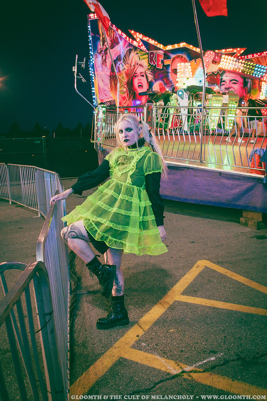 Azura wore our “Limerick” dress which we discovered GLOWS UNDER BLACK LIGHT!!! It was the perfect dress for this shoot, layered over black bloomers and a blouse it absolutely glowed just like the rides around us. You can shop it in sizes S-6X on our site or in our IRL store Doll Funeral in Toronto.