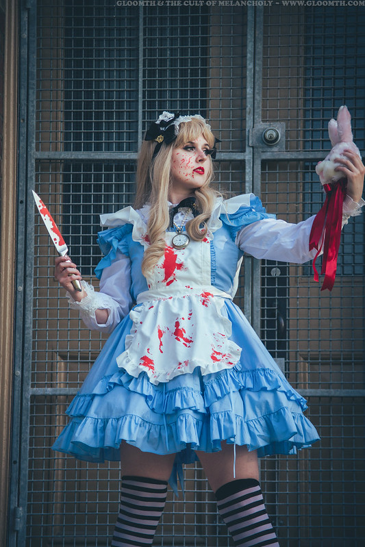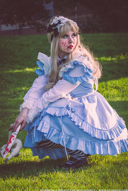 Pixie wore our “Alice’s Pool of Tears” dress with a bloodied apron and a big knife for a quick warrior Alice costume! I love the blood splattered makeup Pixie created for this shoot, it’s just perfect!!! I also cut a pink toy bunny head off of it’s body and added some red ribbon to make a blood effect as a prop, I think it works fairly well in the photos.