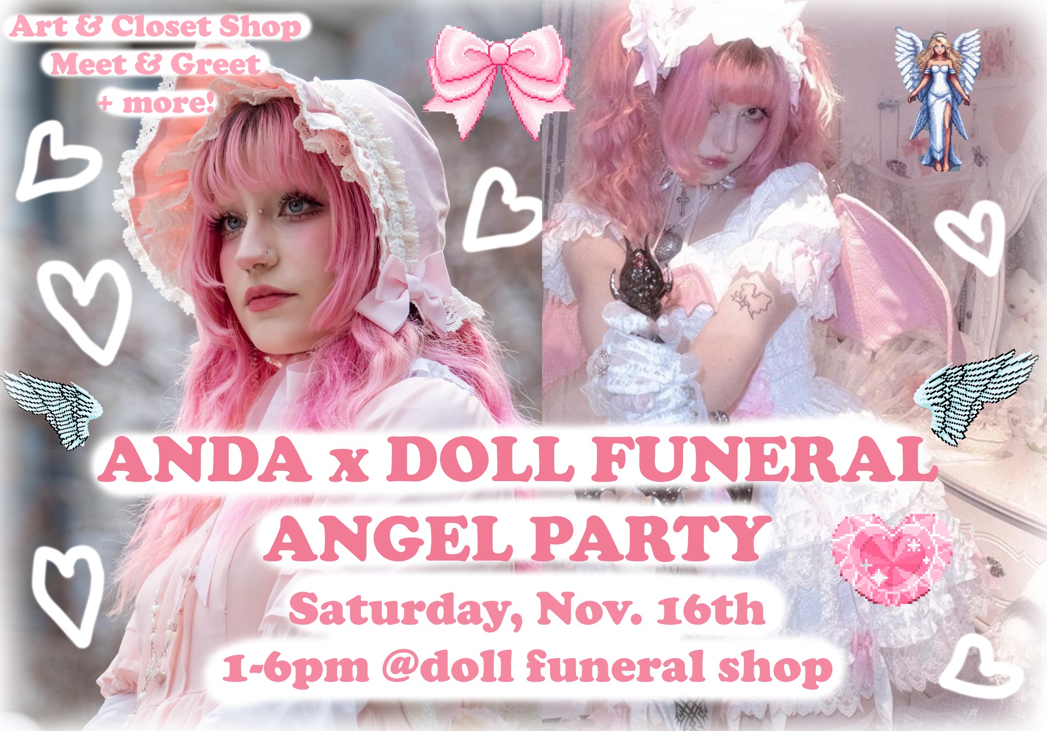This coming Saturday, November 16th, we’re hosting an Angel Party with Anda!!!! I got to shoot with Anda during my last visit to Montreal and I’m excited to showcase her incredible artwork and wardrobe in our shop Doll Funeral for the day!