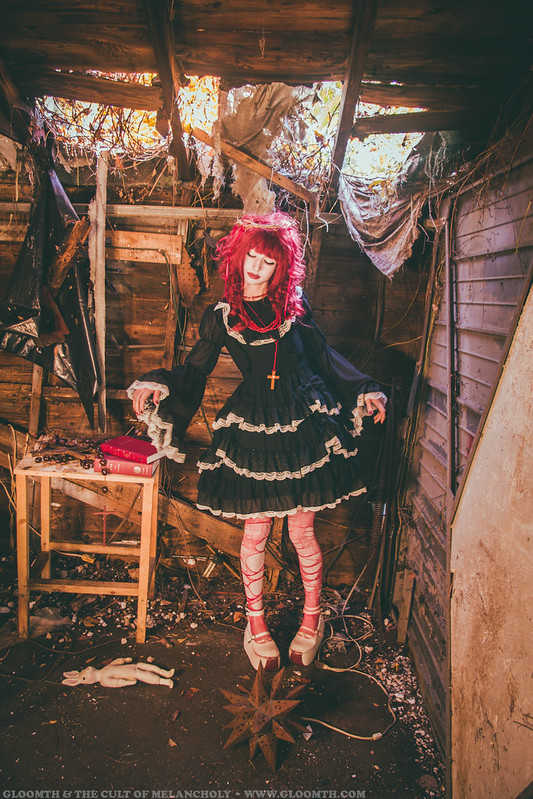 Recently a friend of mine offered us their crumbling shed for a venue! Which honestly couldn’t have been a more eerie and strange setting for a shoot. The ceiling has collapsed in one corner, and the autumn vines and leaves are slowly retaking the space. Yas is wearing our “Demon Court” dress and “Aka Kanashimi” red and white jsk, both can be found on our site or in our IRL store Doll Funeral in Toronto.