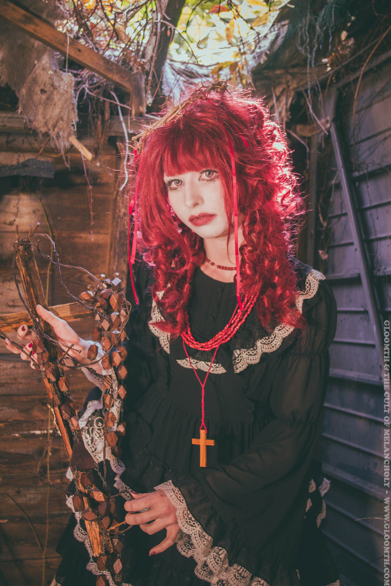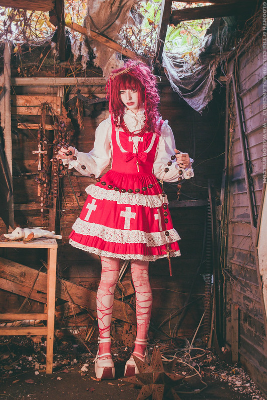 Recently a friend of mine offered us their crumbling shed for a venue! Which honestly couldn’t have been a more eerie and strange setting for a shoot. The ceiling has collapsed in one corner, and the autumn vines and leaves are slowly retaking the space. Yas is wearing our “Demon Court” dress and “Aka Kanashimi” red and white jsk, both can be found on our site or in our IRL store Doll Funeral in Toronto.