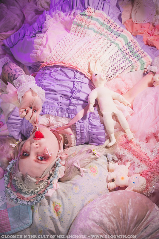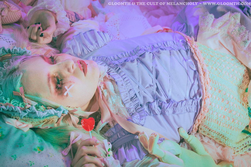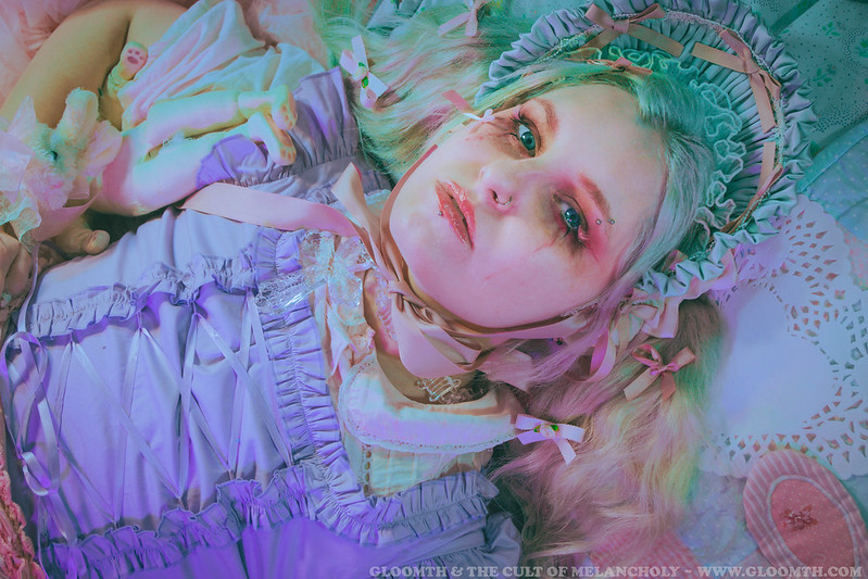 I coordinated the dress with pastels and vintage elements, and a gorgeous ornate bonnet I’ve been saving for a shoot! With smeary bloody makeup and a bright red heart lollipop as a prop this shoot came together pretty well.