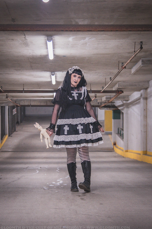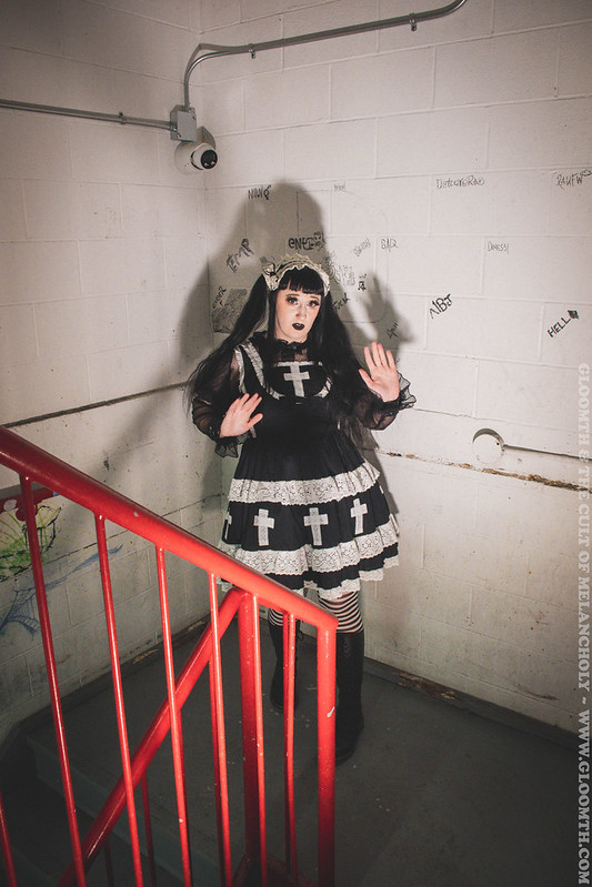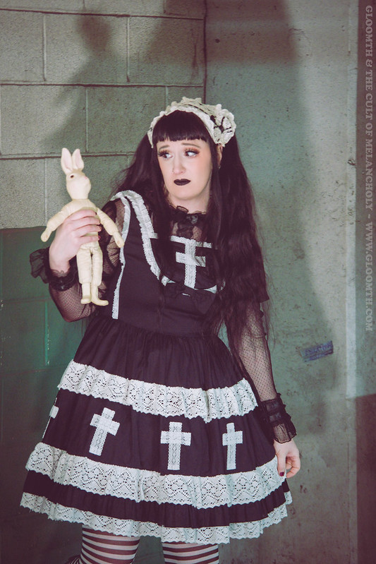Lor is wearing our “Church” jsk in black here! You can shop this dress on our site or come by our IRL store Doll Funeral to try one on in person. 🙂