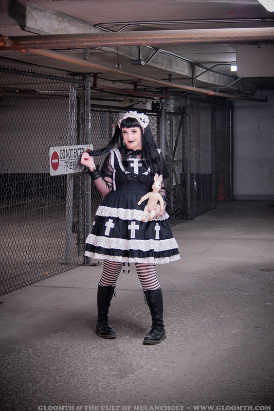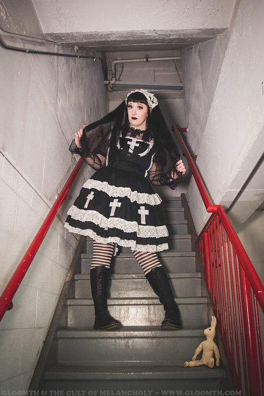 Lor is wearing our “Church” jsk in black here! You can shop this dress on our site or come by our IRL store Doll Funeral to try one on in person. 🙂