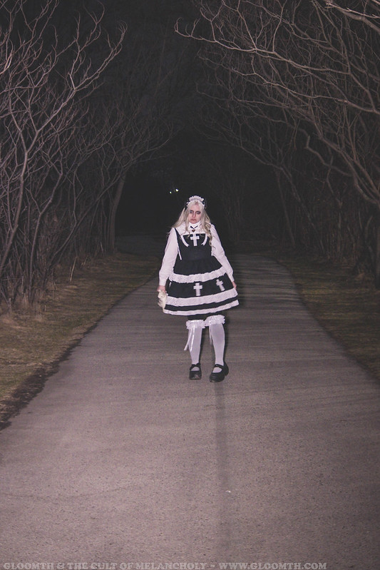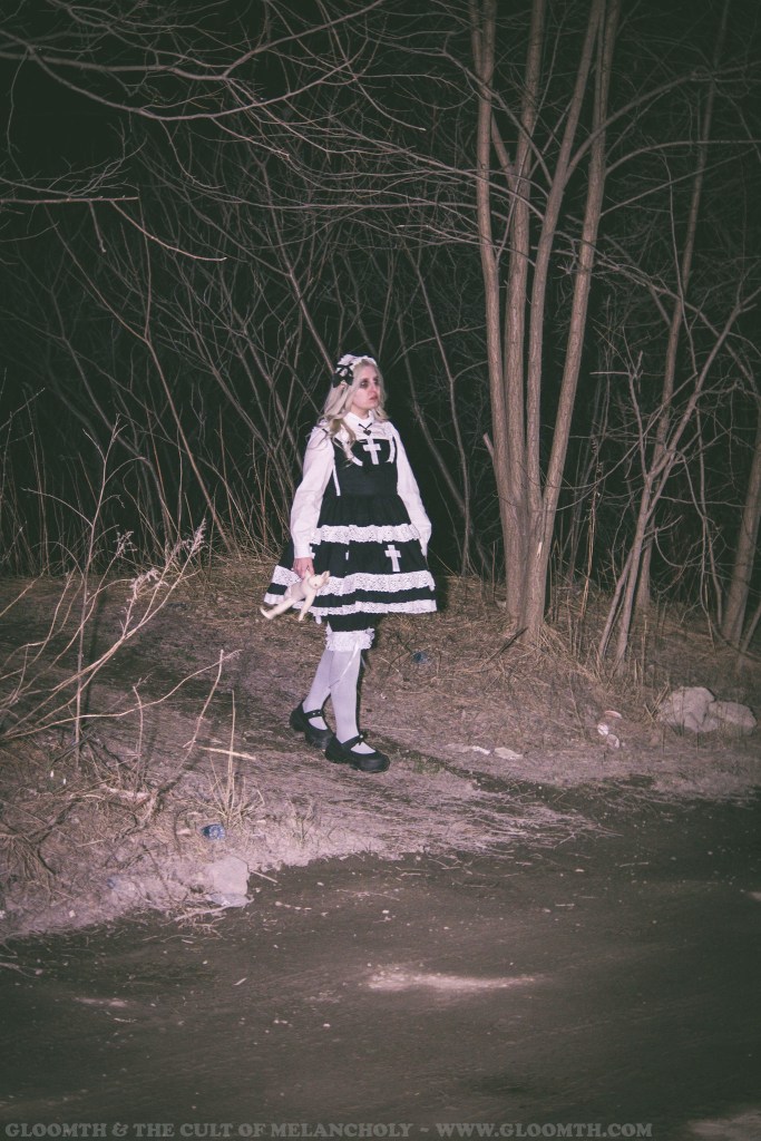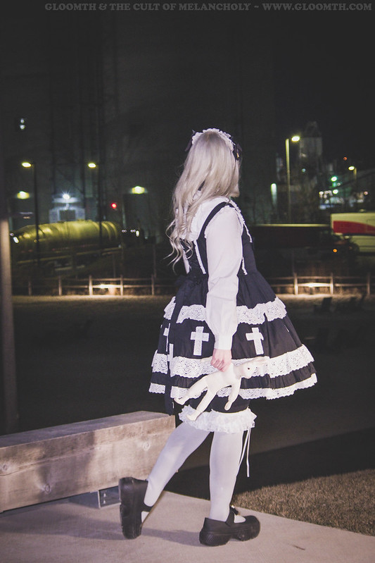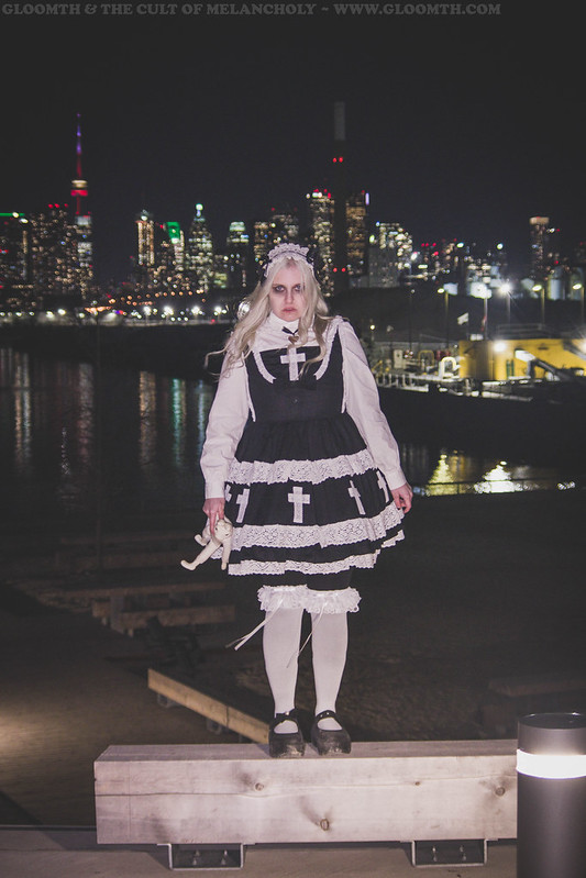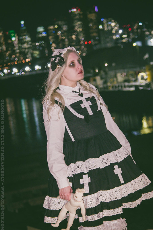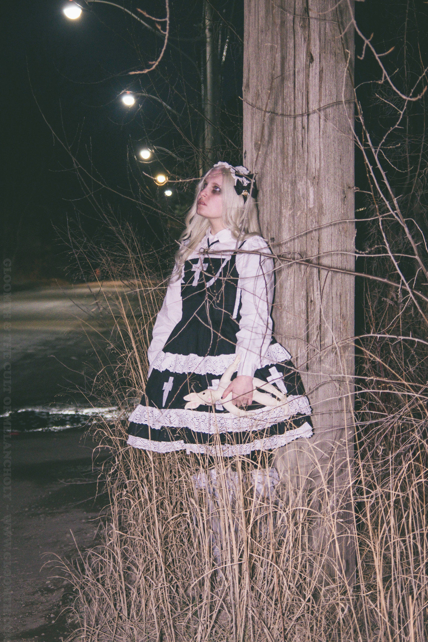 In some the city glitters behind and in others we kept the weird tangle of trees as a backdrop. With my little photo light we spotlit the environment to a really interesting effect. Azura is wearing our “Church” jsk.