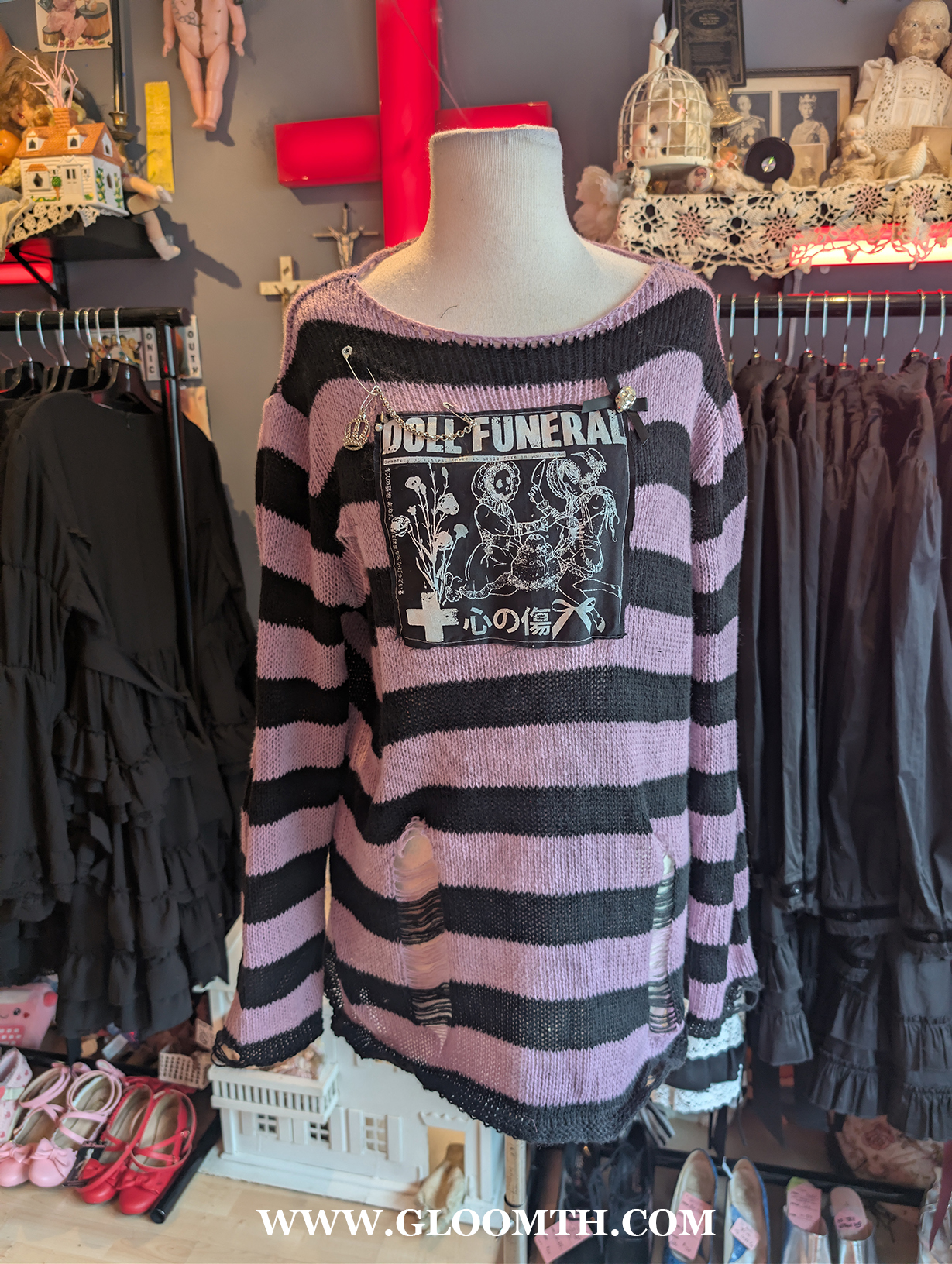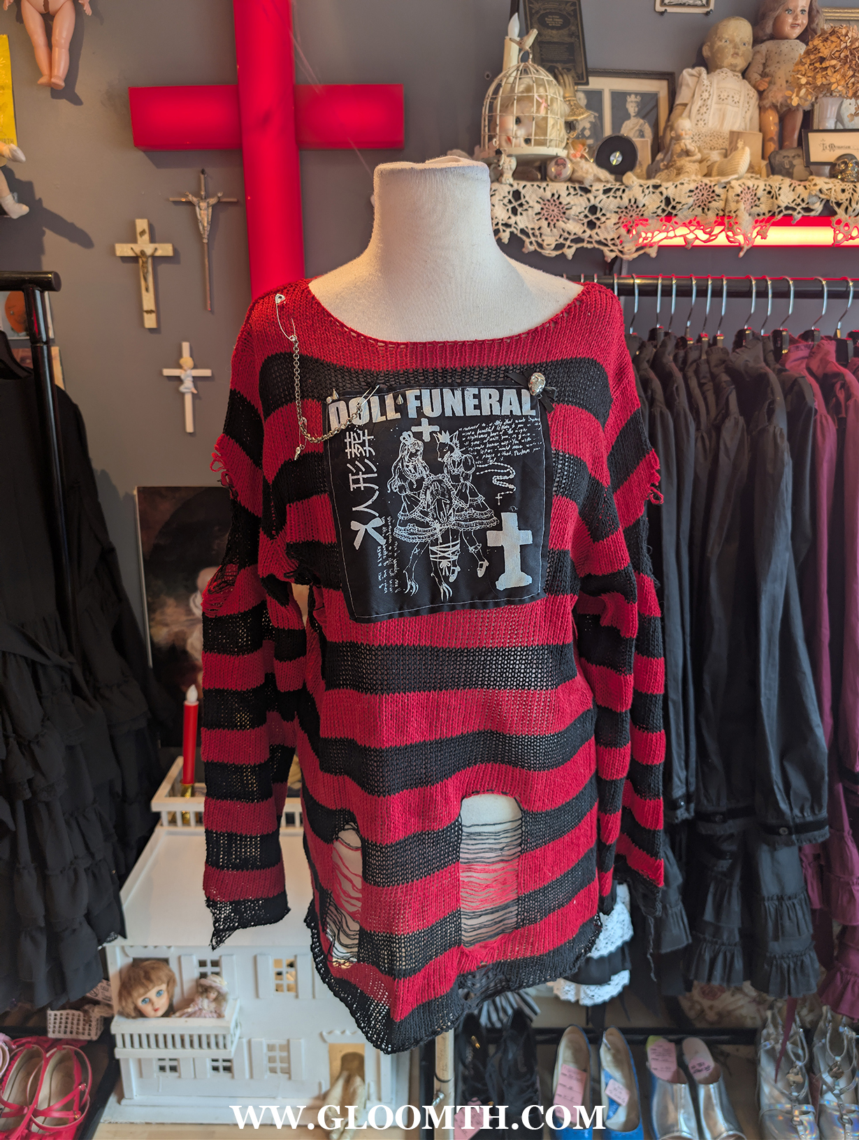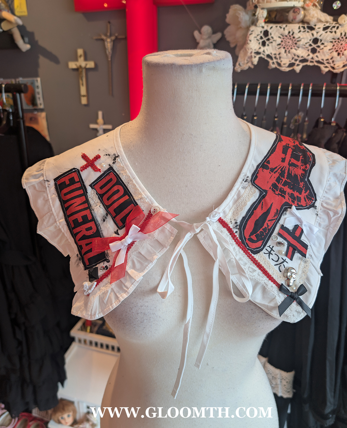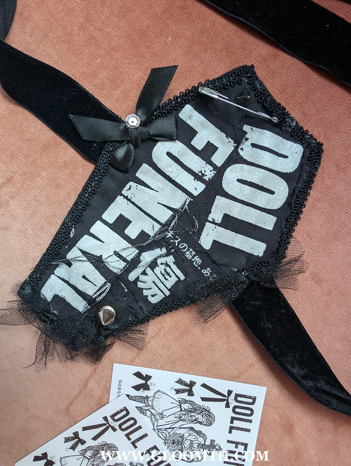 When I first began Gloomth I made everything myself. Either from scratch or altered vintage. I’d spend my days camped out with my sewing machine and my kitten (RIP Atticus). Then photograph and post the items weekly. My work then was very punk inspired, tattered edges, hand printed graphics, chains and bows.